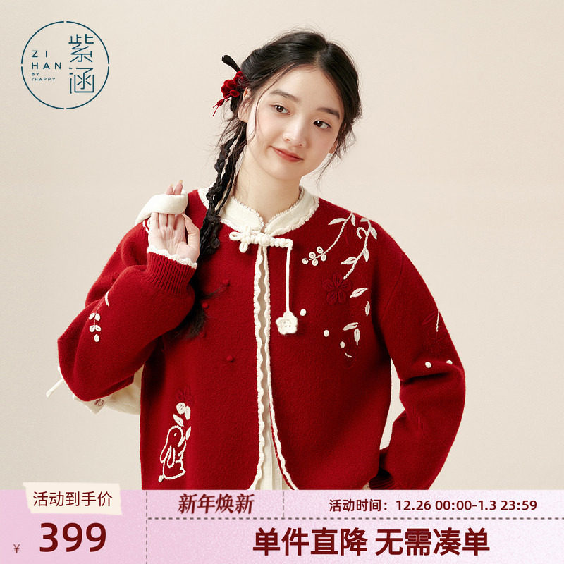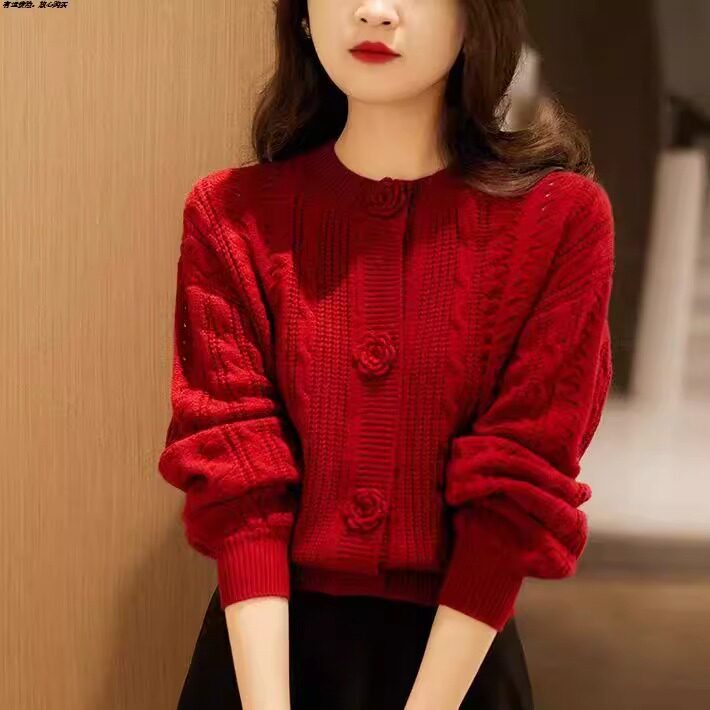 紫涵红色盘扣针织开衫女冬季新款新中式手钩花刺绣灯笼袖毛衣外套