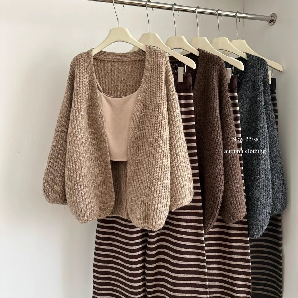 加厚版!复古咖慵懒风粗针灯笼袖针织衫温柔风秋冬开衫毛衣外套女