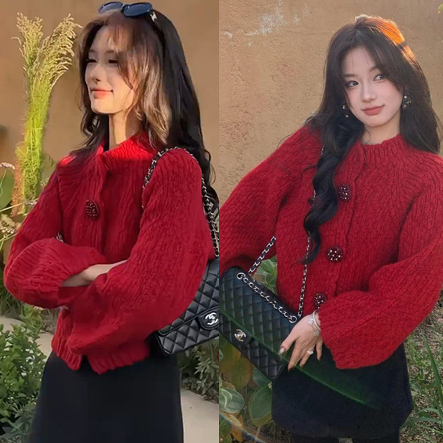韩系灯笼袖单排扣红色短款毛衣女冬圣诞穿搭宽松显瘦针织开衫外套