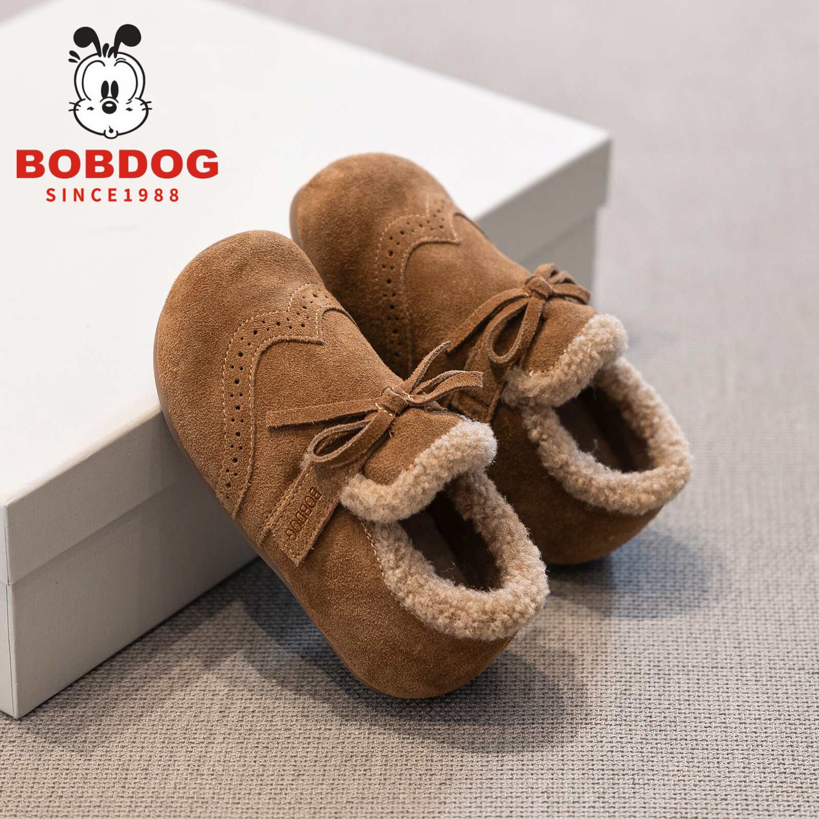 巴布豆真皮女童毛毛鞋加绒勃肯鞋2025冬季儿童保暖棉鞋女孩豆豆鞋