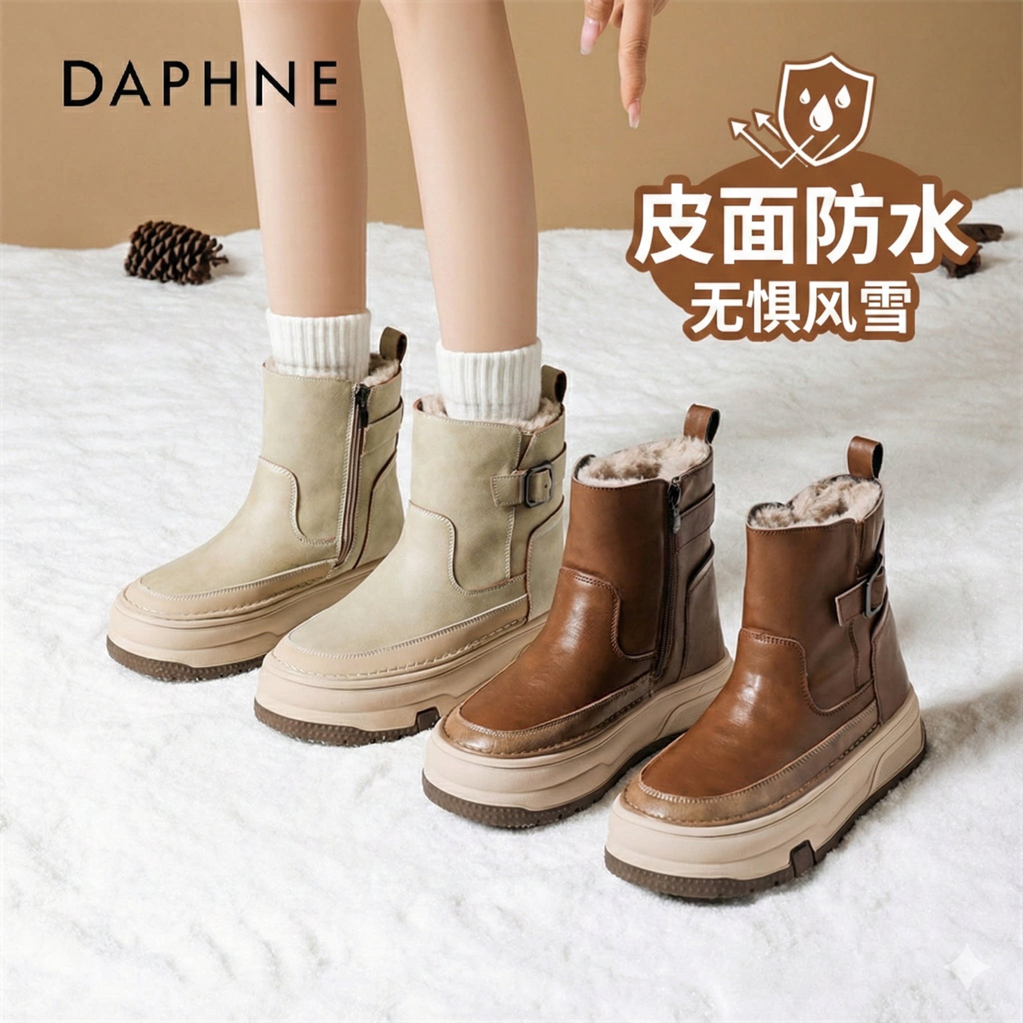 达芙妮皮面防水雪地靴女冬季2025新款加绒保暖毛毛鞋防滑外穿棉鞋