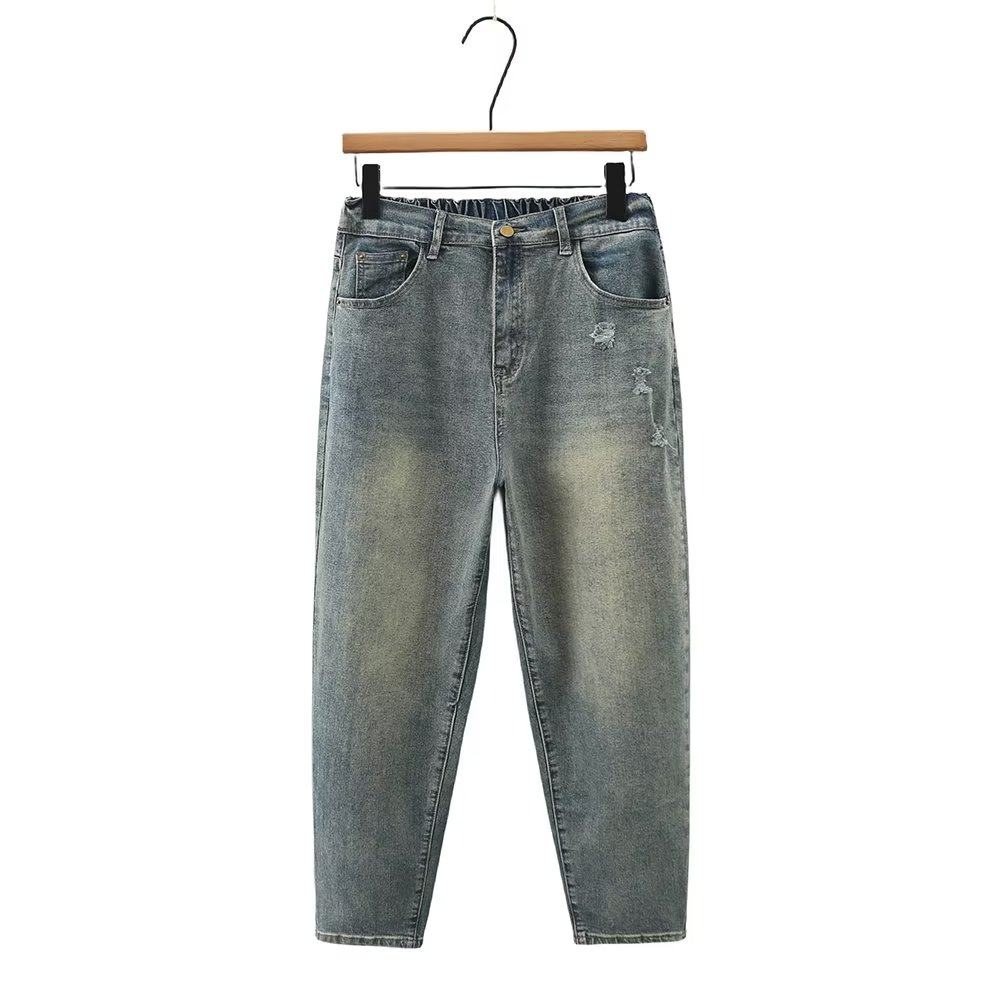 破洞水洗复古蓝牛仔裤200斤高腰显瘦小个子大码哈伦裤九分老爹裤