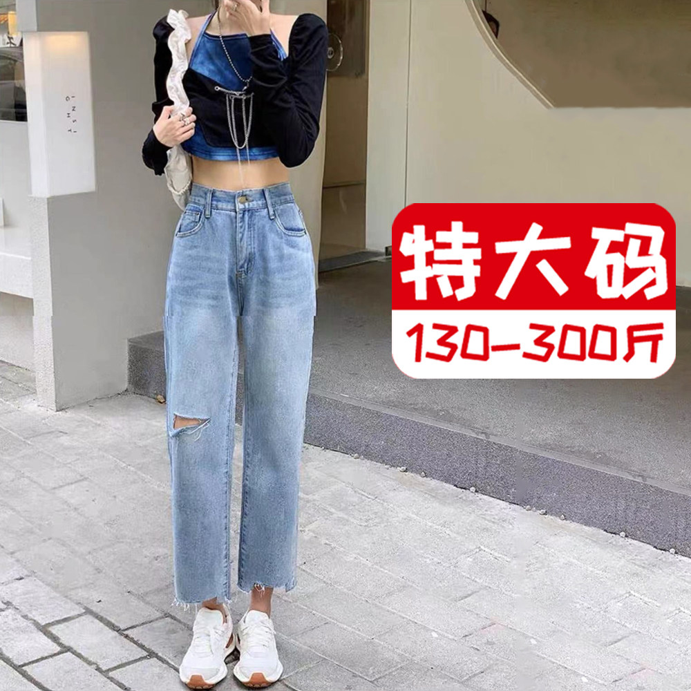 300斤特大码破洞直筒牛仔裤女夏季200斤胖妹妹mm遮胯阔腿九分裤子