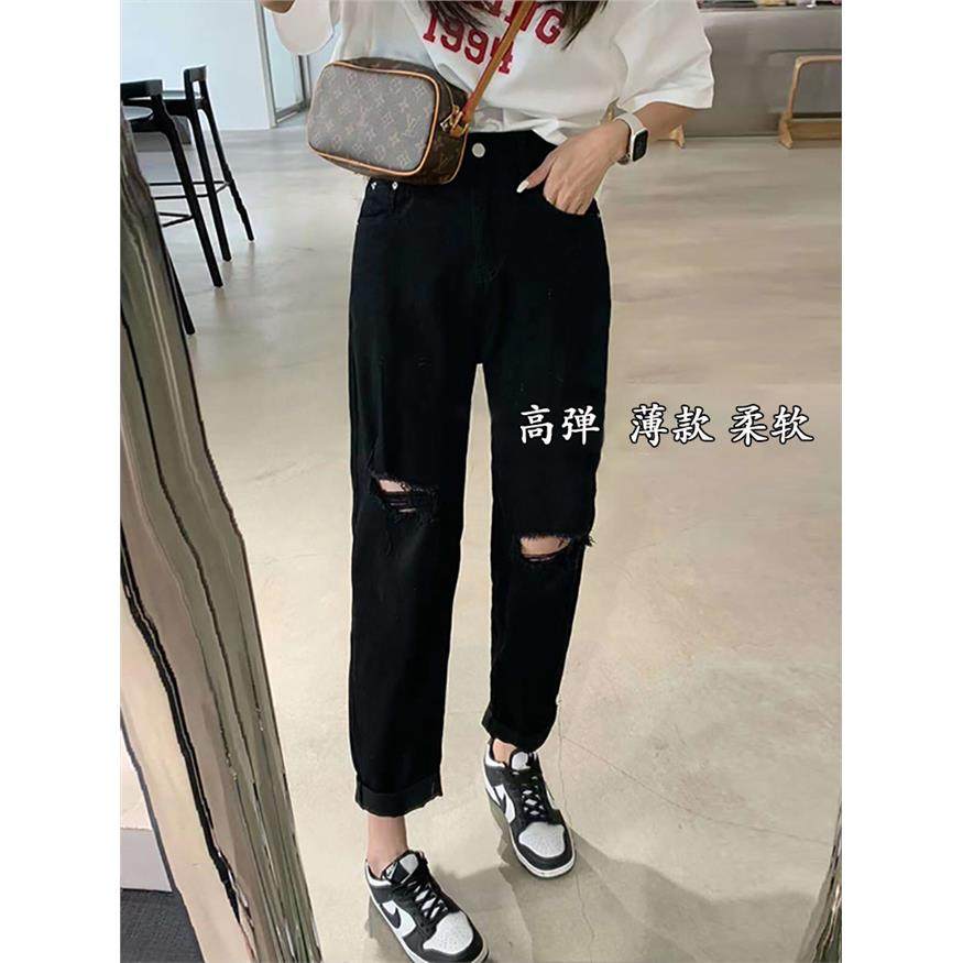 破洞牛仔裤女夏季胖妹妹大码高腰宽松显瘦薄款弹力九分烟管直筒裤