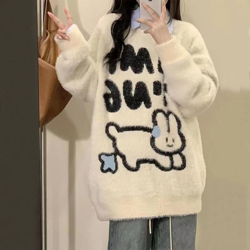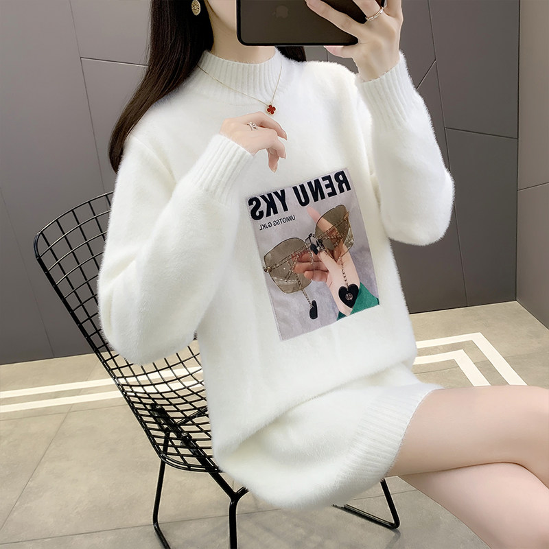 加厚版!慵懒风可爱提花水貂绒套头毛衣女秋装宽松中长款针织衫潮