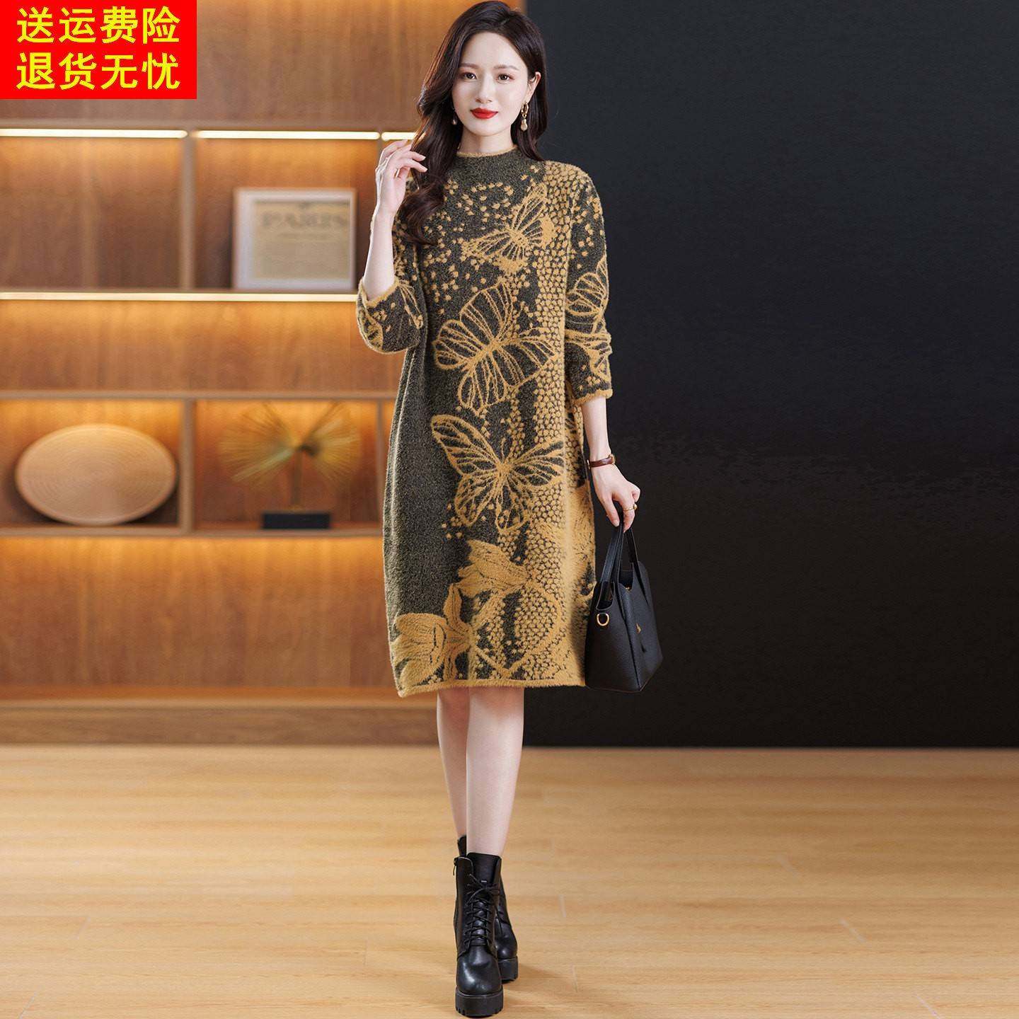 花色仿水貂绒毛衣裙中长款连衣裙打底衫女秋冬加厚水貂绒洋气内搭