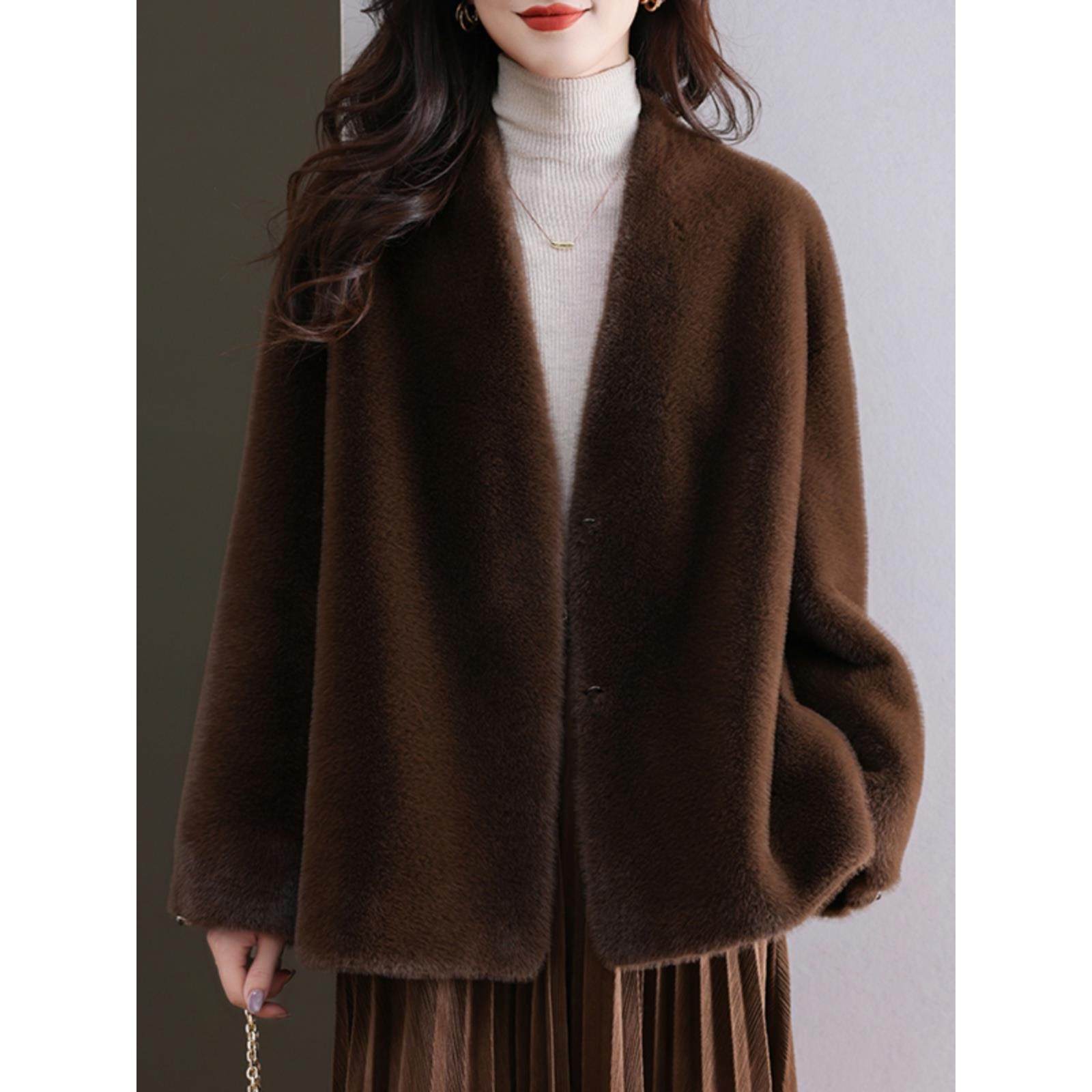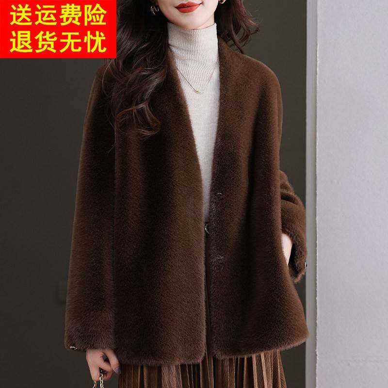 水貂绒皮草大衣外套女开衫中长款宽松大码女装加厚羊毛衫披肩口袋