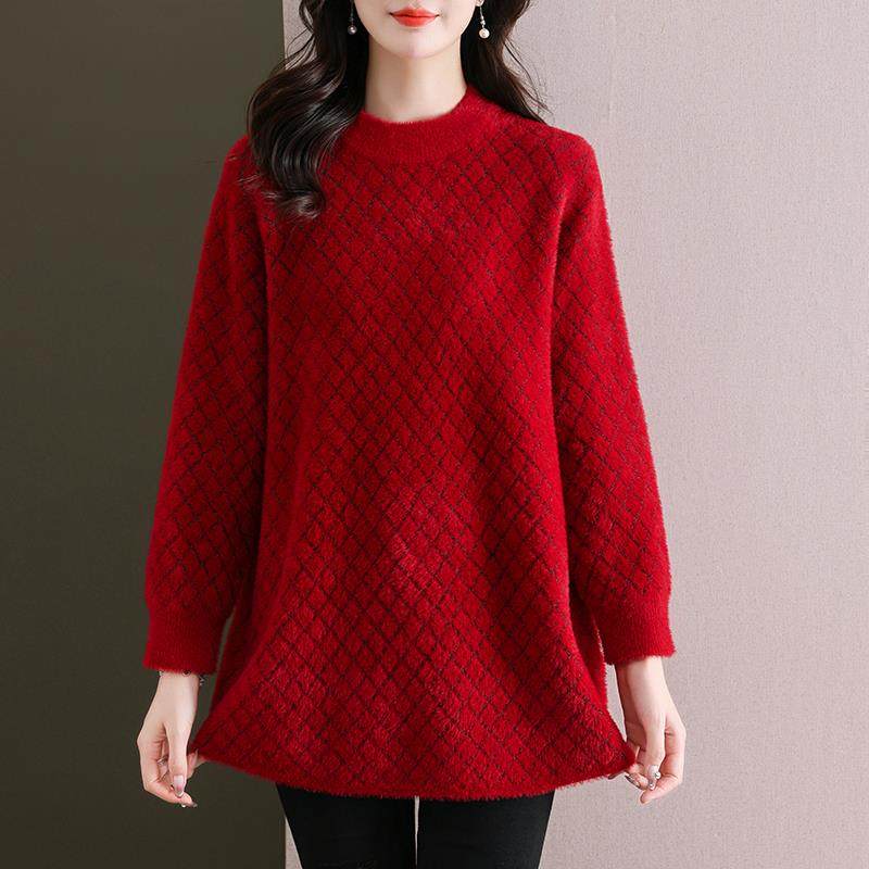 仿水貂绒毛衣女慵懒风大码春秋加厚中长款上衣圆领针织衫打底外搭