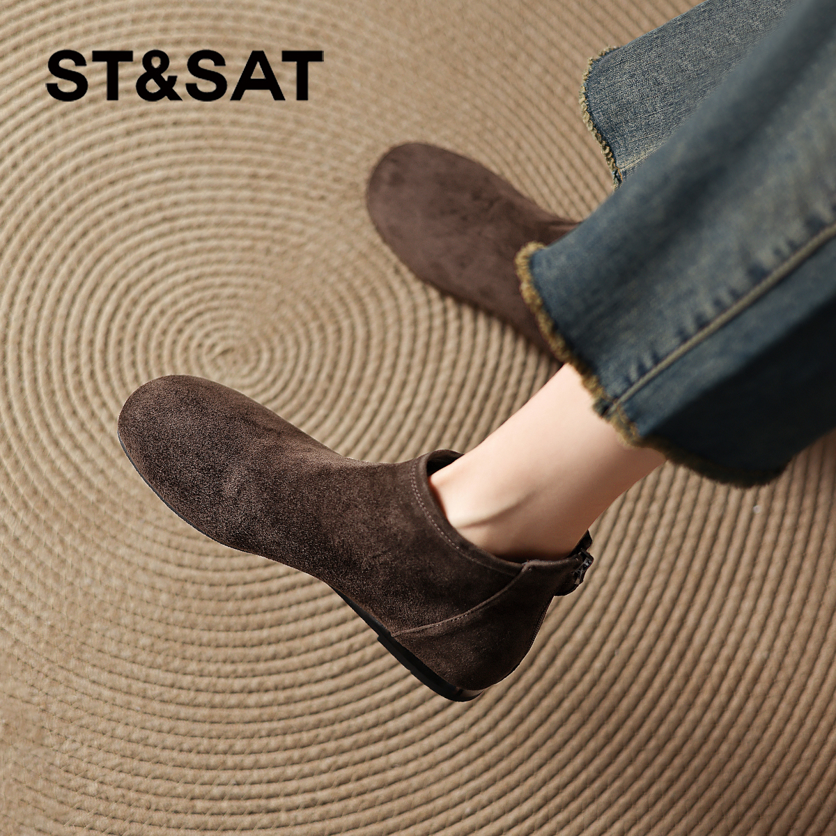 星期六棕色短靴女秋冬2025新款复古羊皮马丁靴法式平底瘦瘦靴裸靴