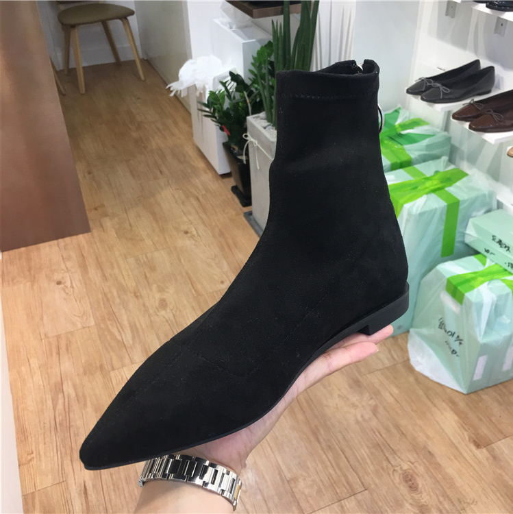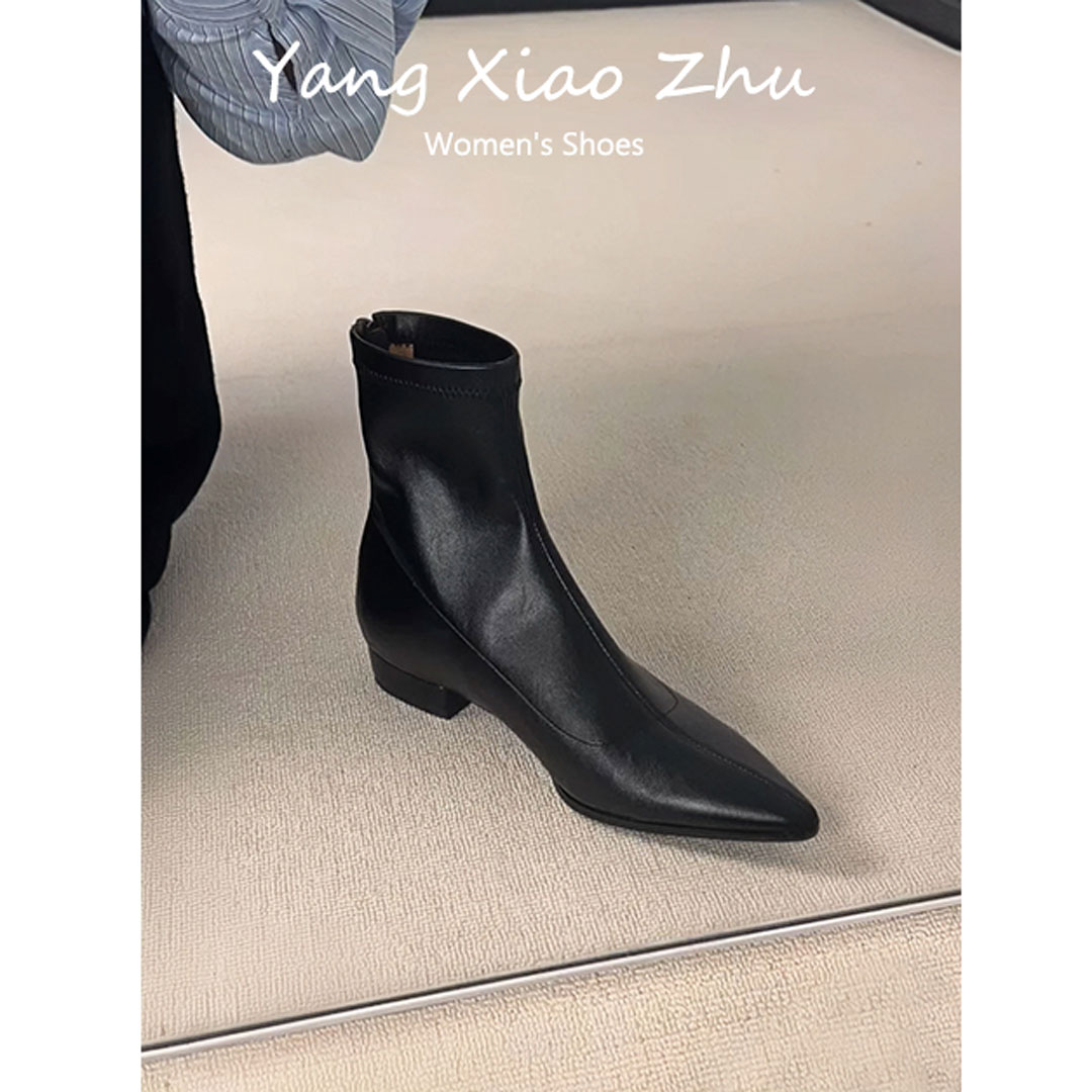 2024秋冬新款平底黑色尖头后拉链短靴女低跟显瘦裸靴弹力瘦瘦靴女