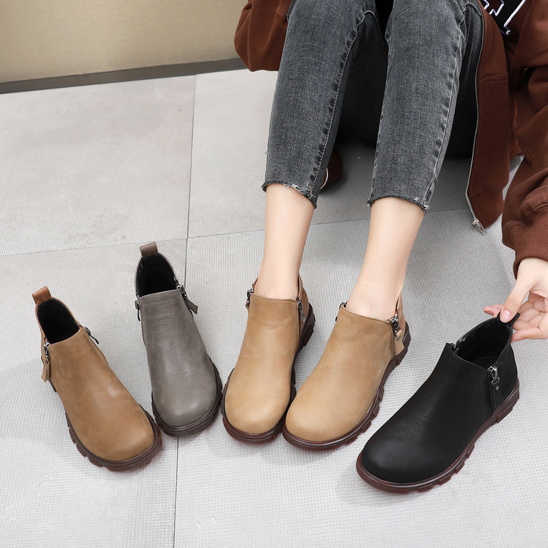 真皮圆头小短靴女复古春秋单靴平底软底大码2024秋冬新款加绒裸靴