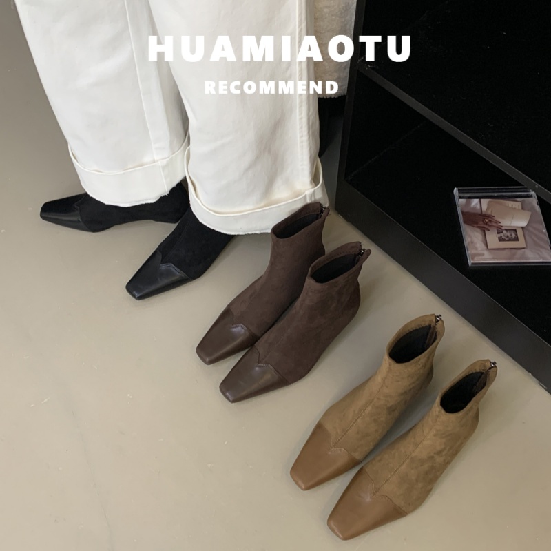 2025秋冬季新款平底瘦瘦靴女方头弹力裸靴绒面马丁靴加绒短靴
