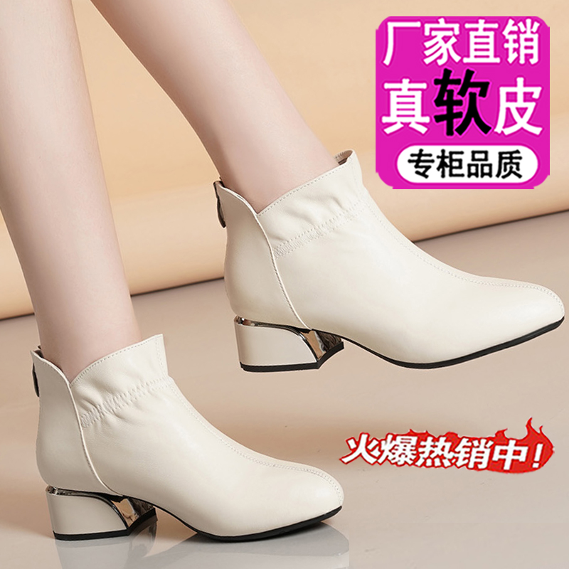 真皮平跟短靴女平底百搭休闲马丁靴春秋单靴裸靴白色女靴软底女鞋