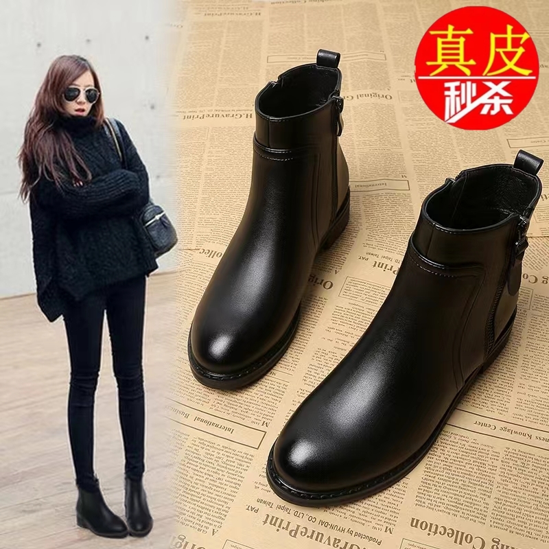 品牌特价真皮马丁靴女2025秋冬新款百搭平底短靴粗跟加绒瘦瘦裸靴