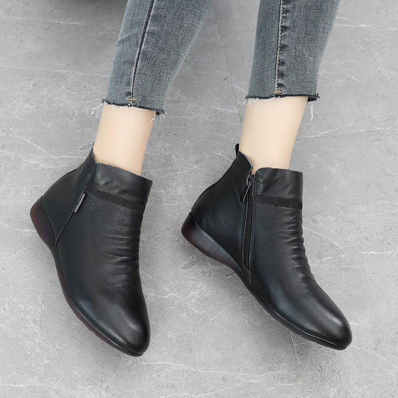 冬季新款加绒短靴真皮软底女舒适平底裸靴防滑短筒尖头牛皮妈妈鞋