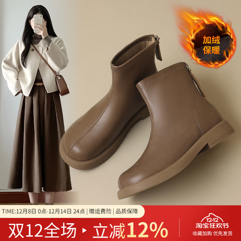 法式复古裸靴加绒短筒靴子女冬季加绒保暖高级感平底洋气小短靴潮