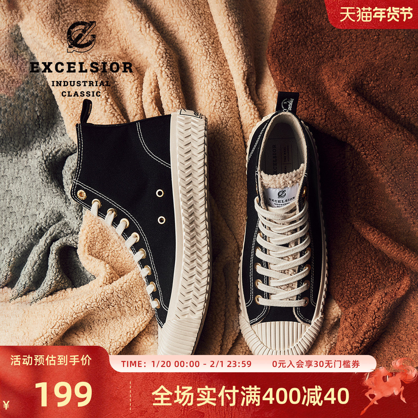 excelsior饼干鞋 秋冬新款板鞋加绒女鞋黑色休闲鞋厚底高帮帆布鞋