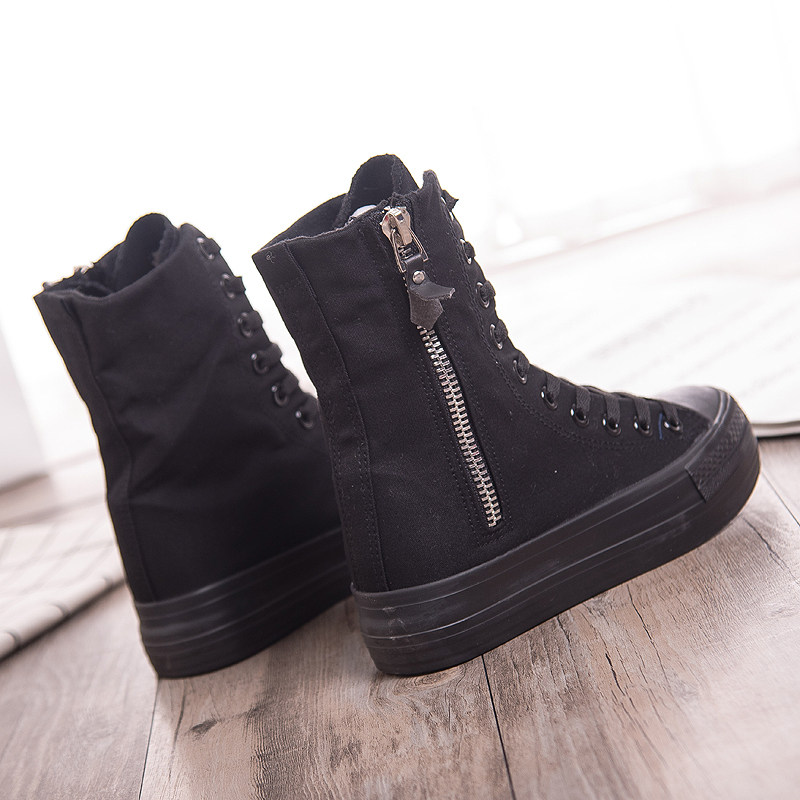 全黑色高a帮厚底帆布鞋 女韩版潮松糕鞋休闲鞋女舞蹈鞋红色女鞋子