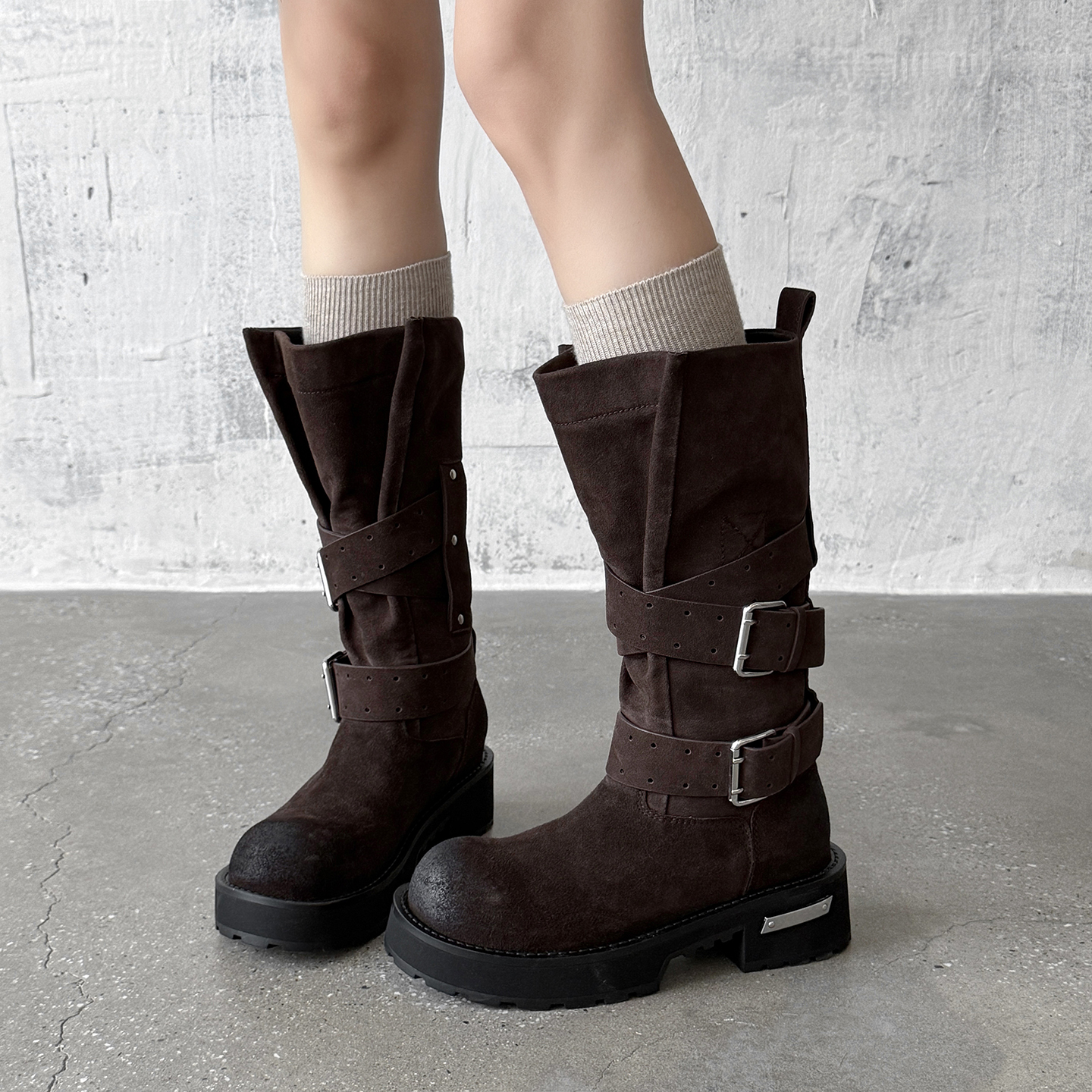 7.5cm厚底绑带中筒西部牛仔靴女2025新款粗跟机车靴子真皮骑士靴