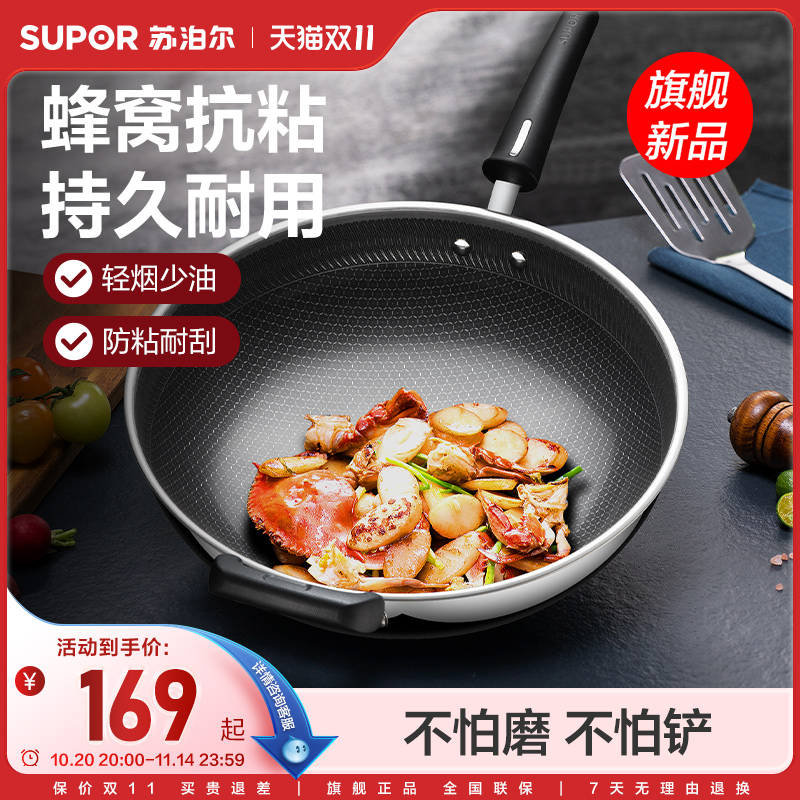 苏泊尔不锈钢蜂窝炒锅不粘锅家用炒锅蜂窝炒菜锅电磁炉燃气灶通用