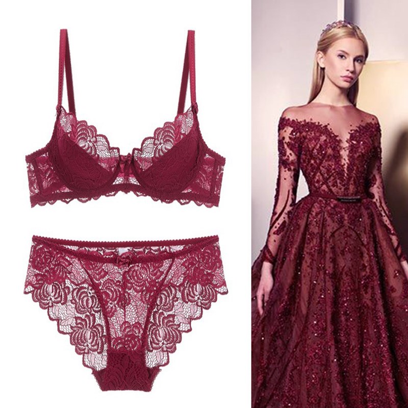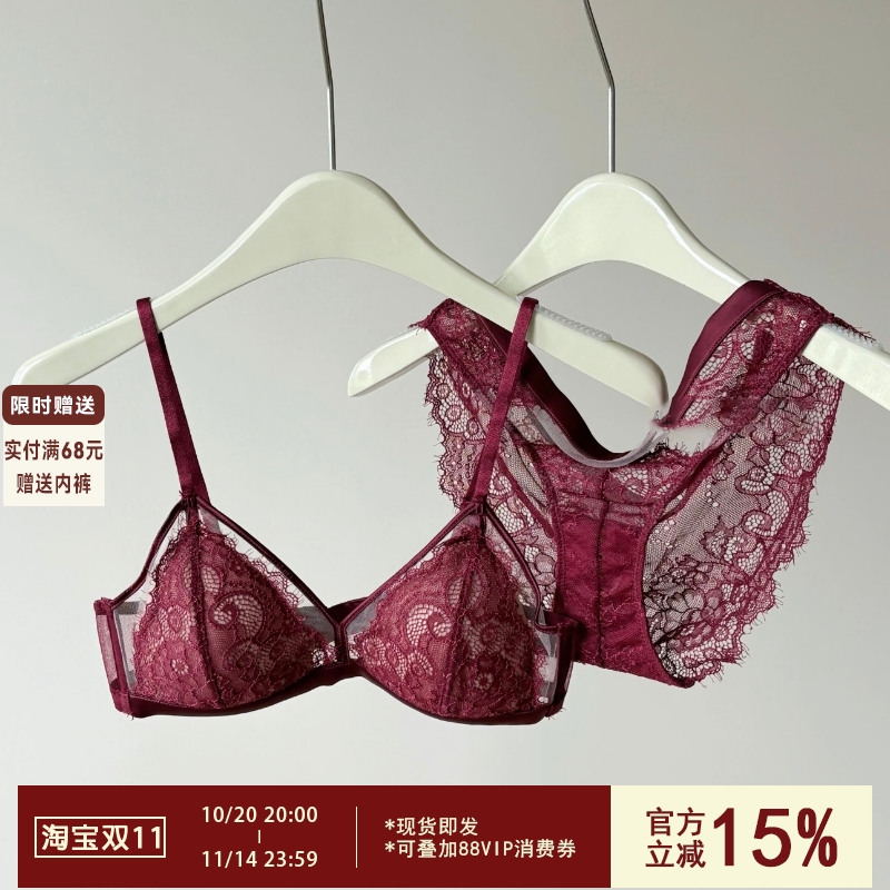 红色本命年内衣超薄款欧美性感蕾丝小胸罩微聚拢文胸套装显小D杯