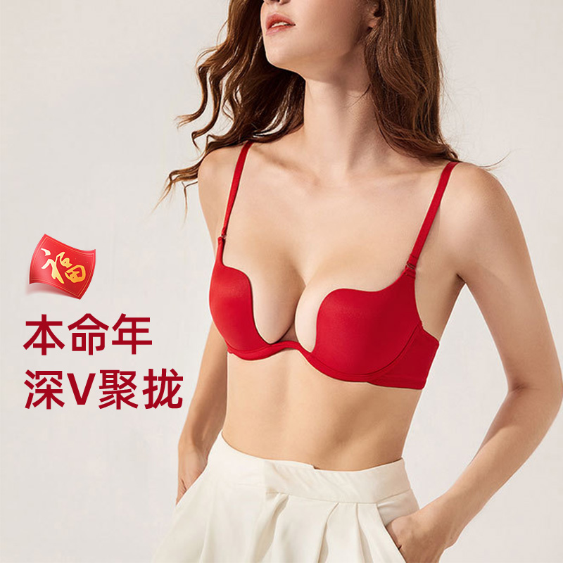 红色本命年内衣隐形露背深v无痕聚拢上托大胸无痕婚纱礼服文胸罩
