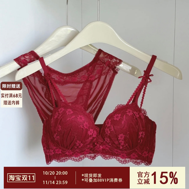 红色本命年内衣女蕾丝性感纯欲小胸聚拢无钢圈结婚新娘文胸罩套装