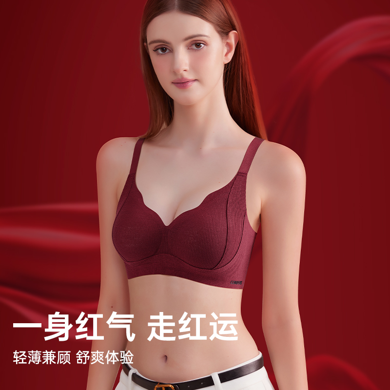 Claesens红色本命年内衣女无钢圈薄款软支撑固定杯小胸微聚拢文胸