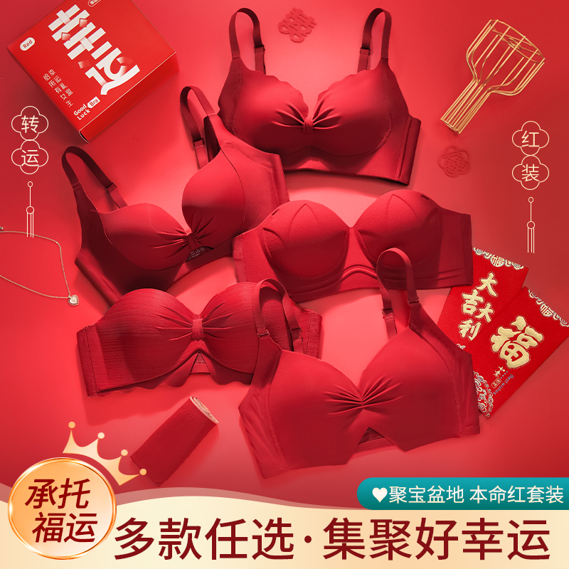 大红色本命年内衣女士无钢圈聚拢小胸中厚款性感文胸罩防下垂上托