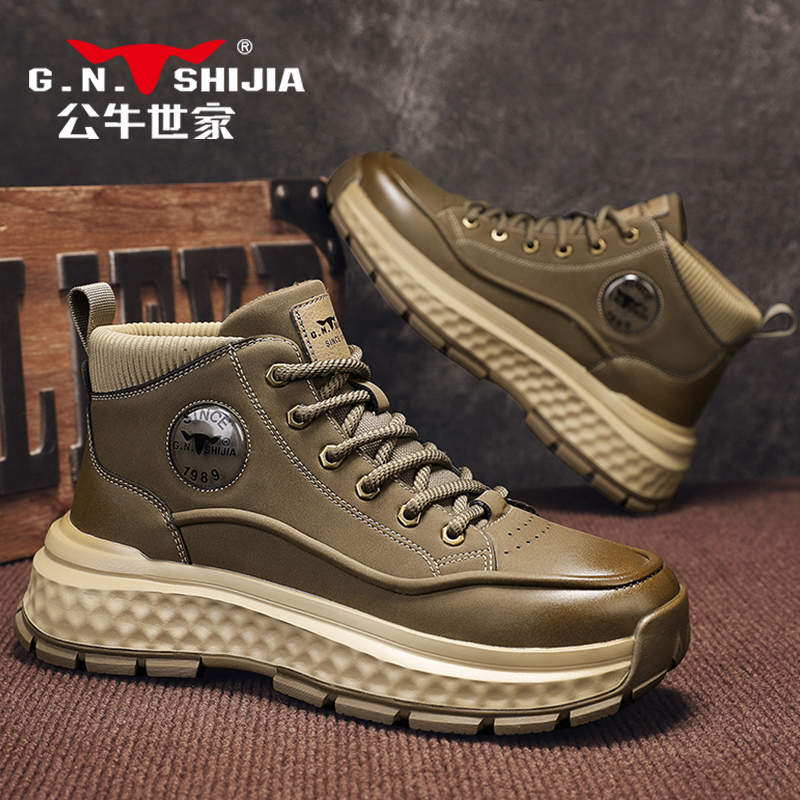 公牛世家高帮鞋男秋季户外真皮休闲运动潮鞋男士耐磨厚底中帮板鞋