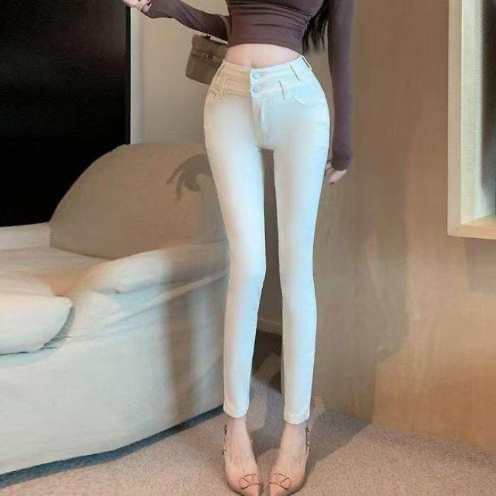 2025秋冬新款小白裤基础双扣百搭收腰显瘦紧身白色小脚裤牛仔裤女