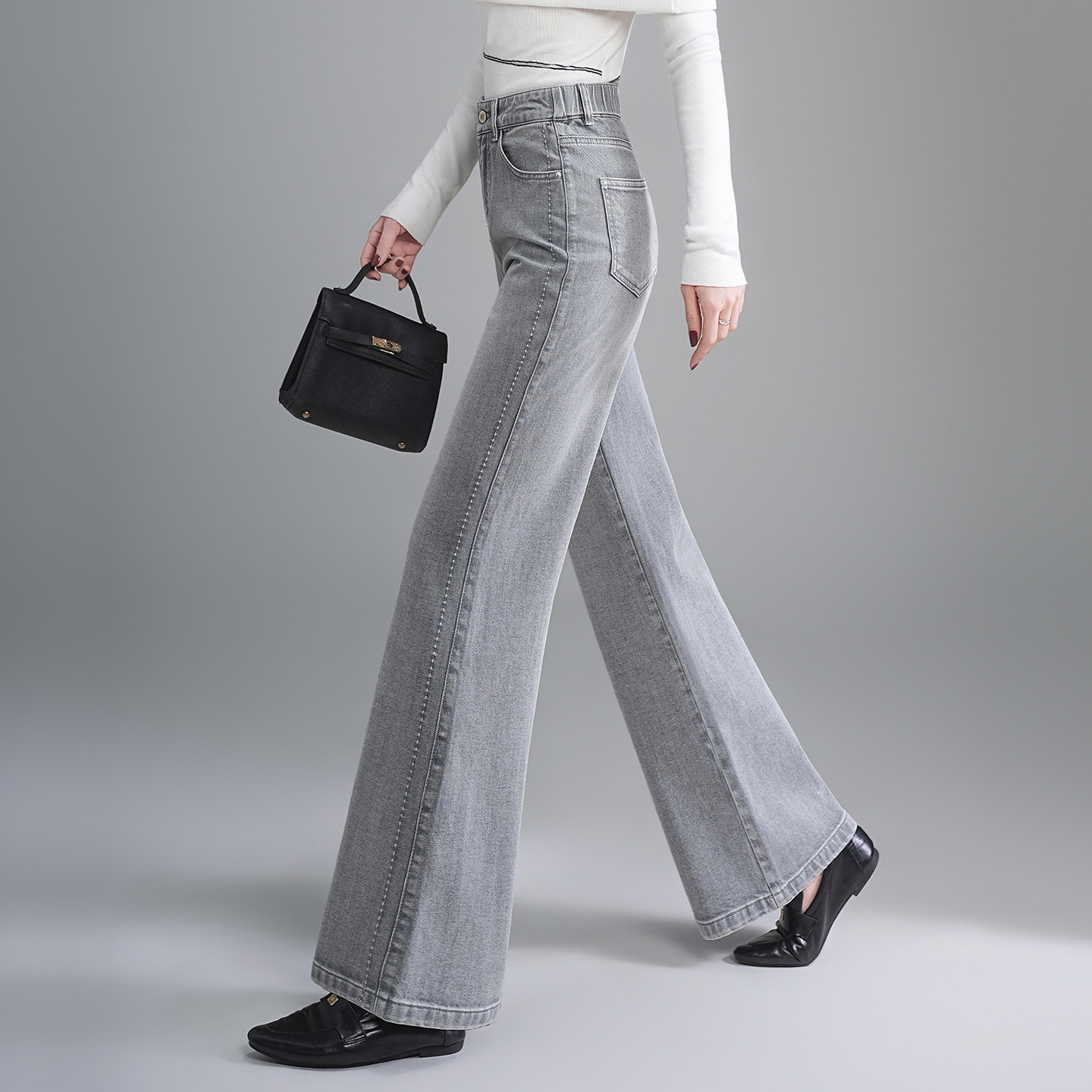烟灰色筒喇牛仔裤女2026新品春高腰拉链后松紧腰阔腿喇叭裤长裤