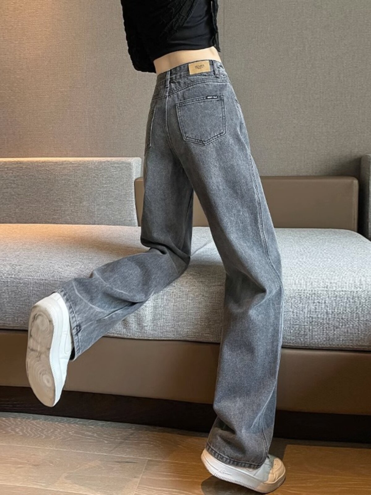 - 高腰牛仔黑色长裤女