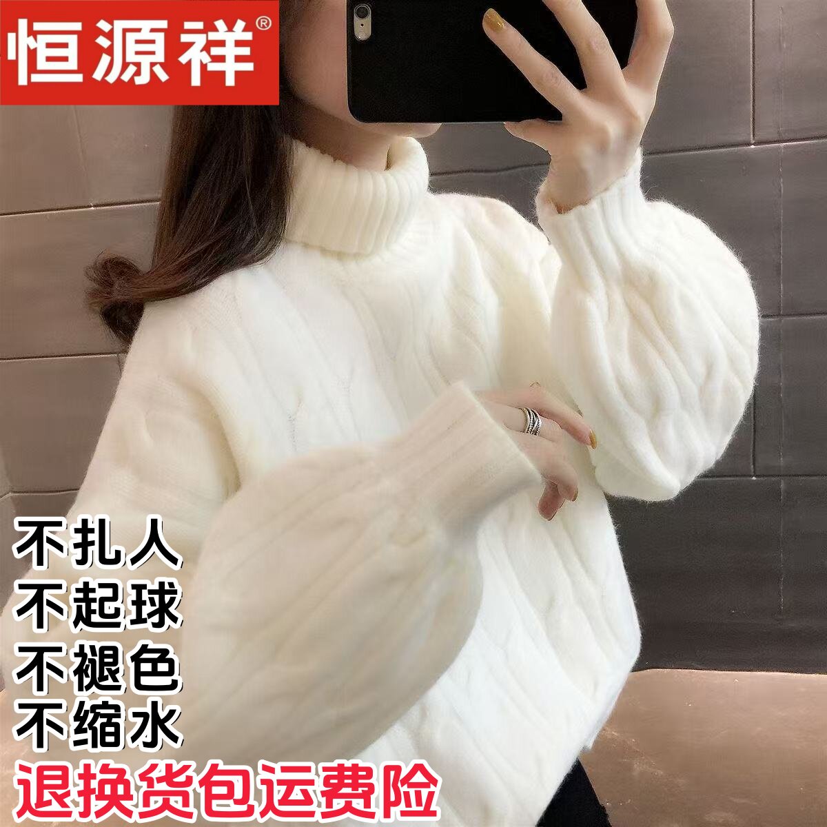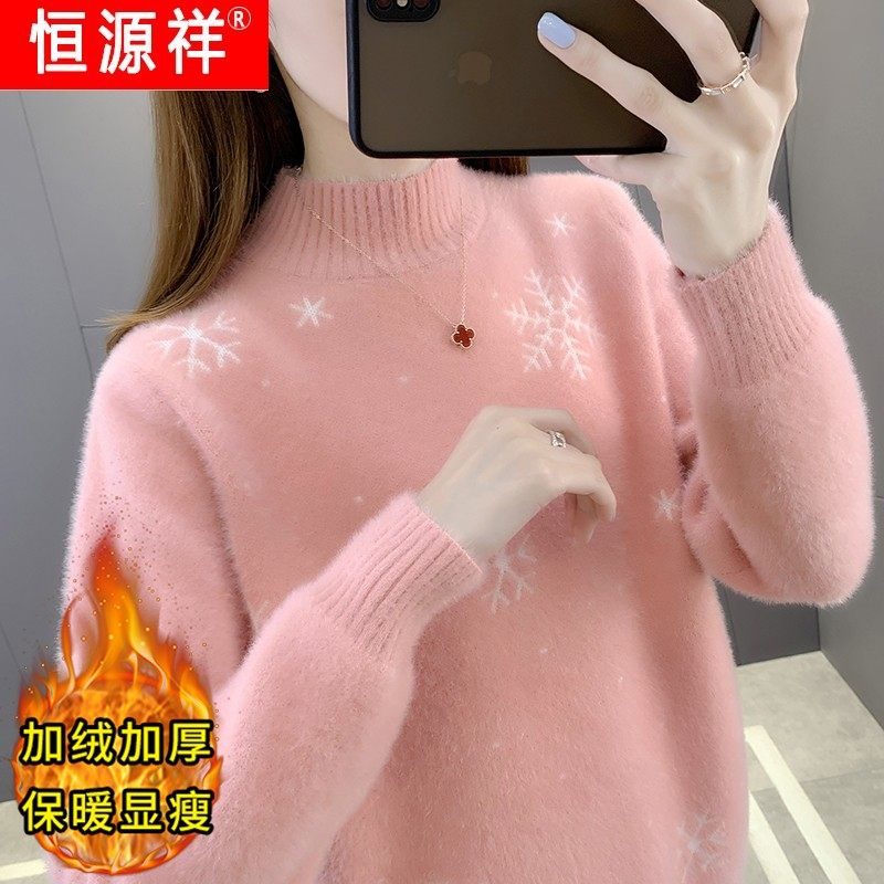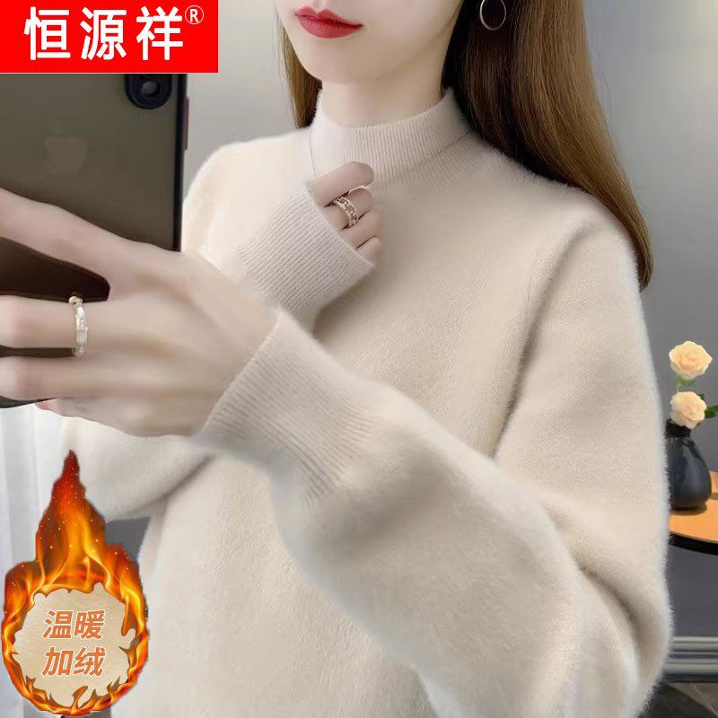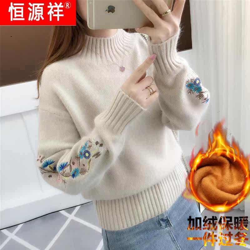 恒源祥官方正品加绒加厚毛衣女秋冬季新款宽松洋气半高领针织打底