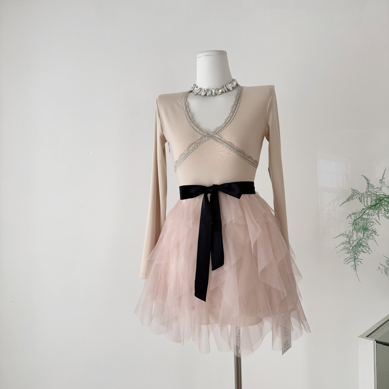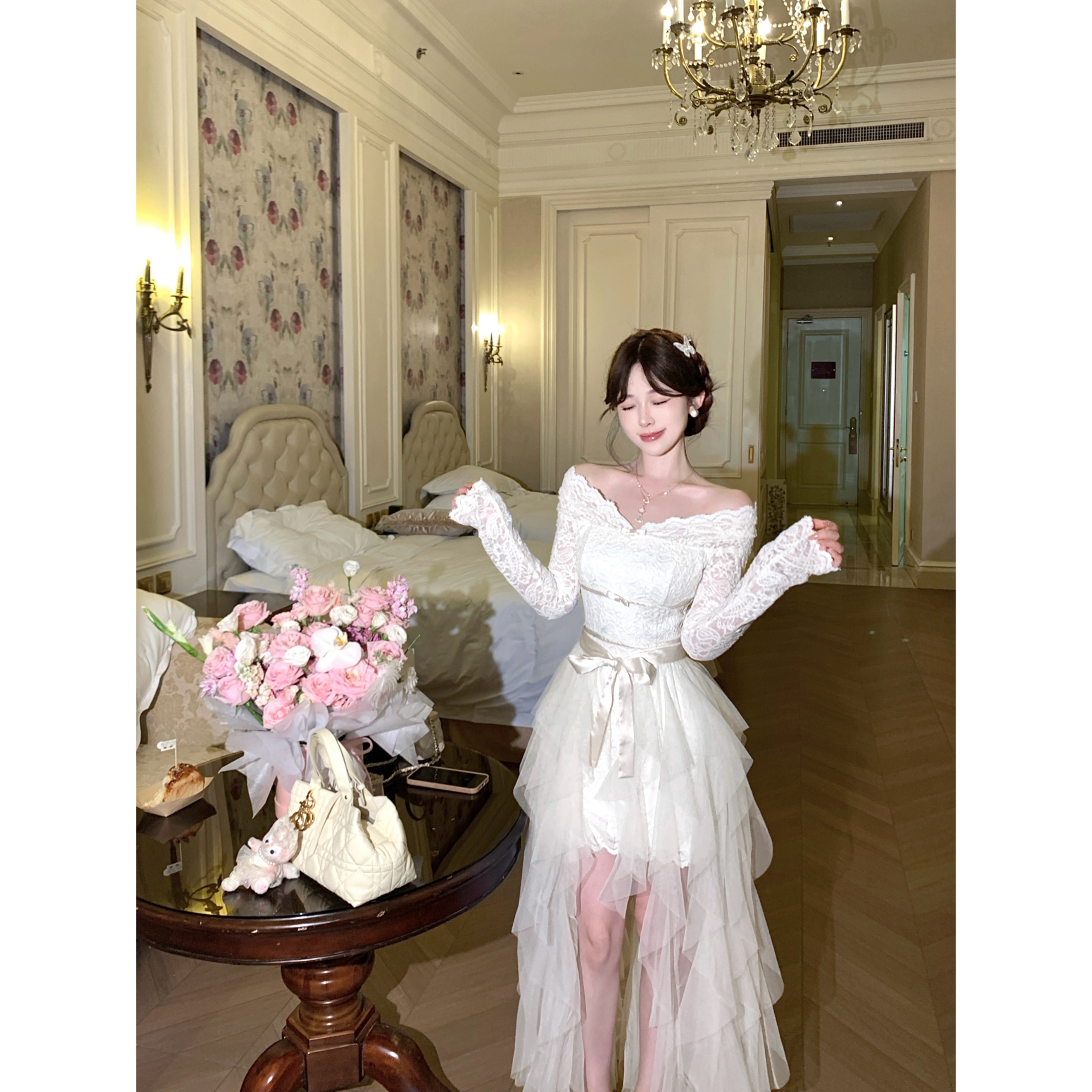 车迟恩Chien 法式公主生日小礼裙秋收腰长袖针织蕾丝网纱连衣裙女