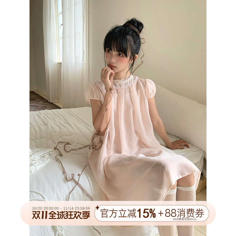 霍里德地图 “雾语”甜美宫廷风网纱镂空蕾丝圆领微透连衣裙女夏