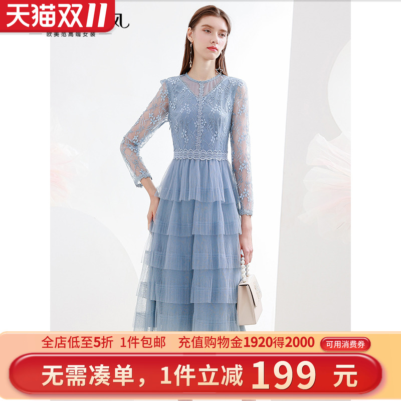 未风蓝色蕾丝网纱连衣裙女秋2025秋装新款女装气质名媛显瘦蛋糕裙