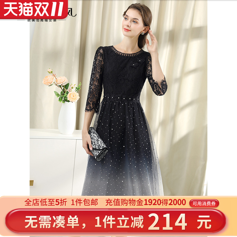 名兰世家妈妈宴会礼服丝绒拼接蕾丝网纱连衣裙显瘦原创设计师品牌