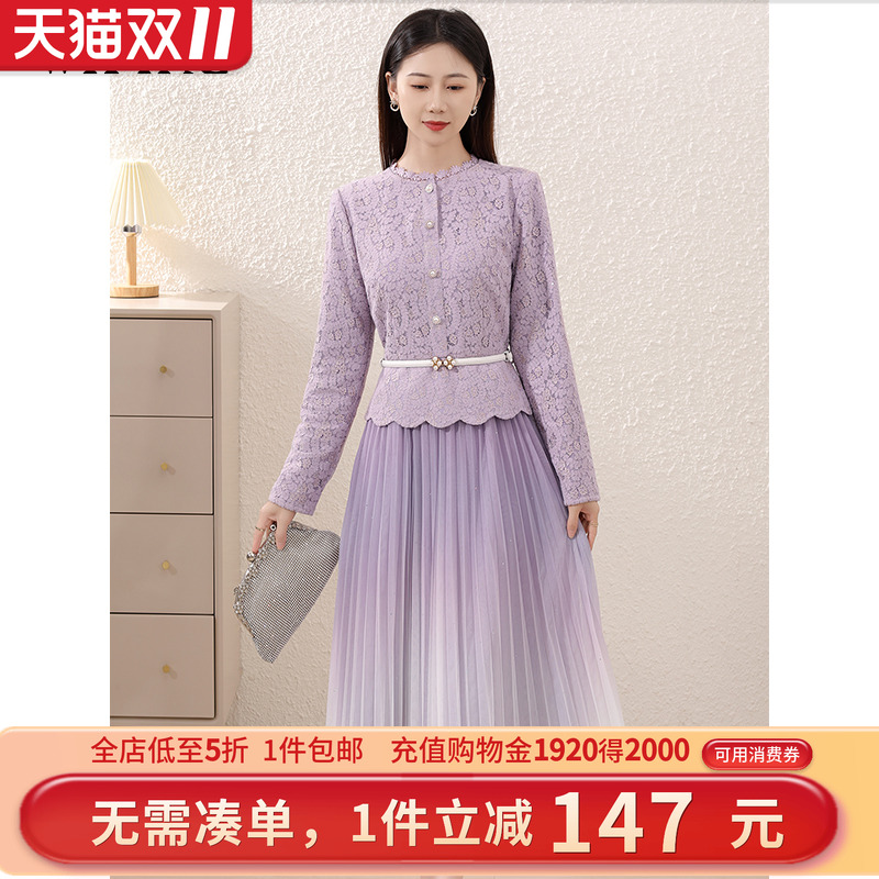 未风紫色蕾丝网纱连衣裙女秋冬2025冬季新款女装气质减龄长袖裙子