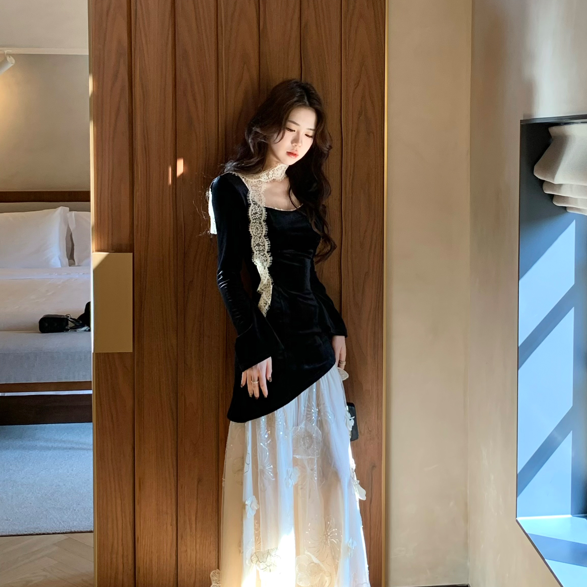 木子李的李设计感长袖方领丝绒拼接蕾丝网纱连衣裙复古修身长裙秋
