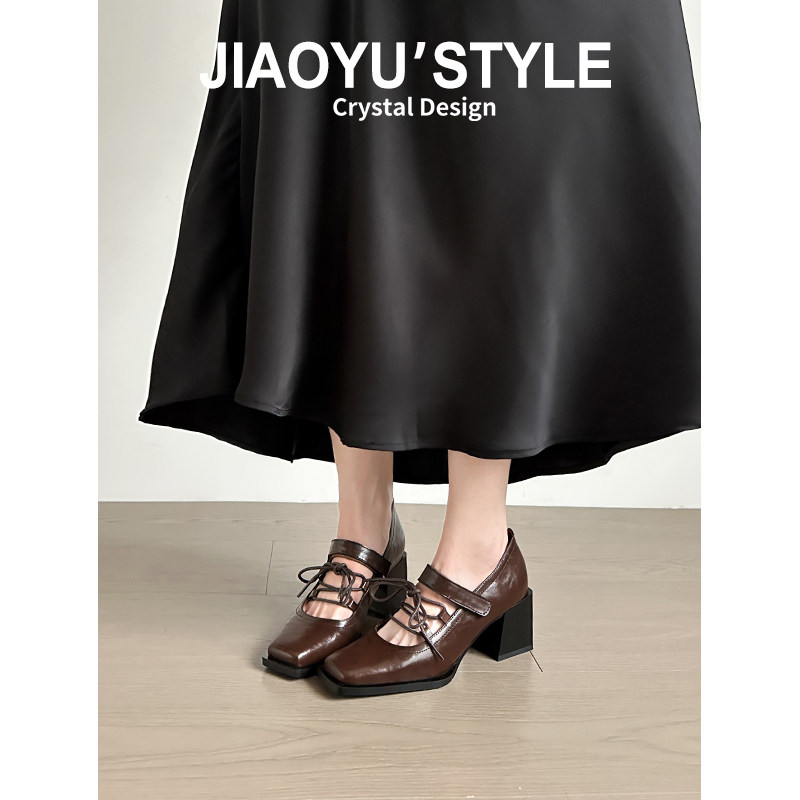 真皮~骄屿棕色复古方头玛丽珍鞋系带粗高跟鞋女百搭气质浅口单鞋
