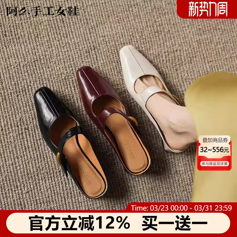 阿么手工女鞋粗跟一字带穆勒拖鞋夏季小方头复古风浅口包头拖新款