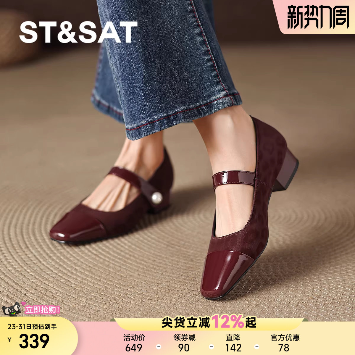 星期六酒红色单鞋女2025方头平底浅口单鞋复古一脚蹬舒适方扣女鞋