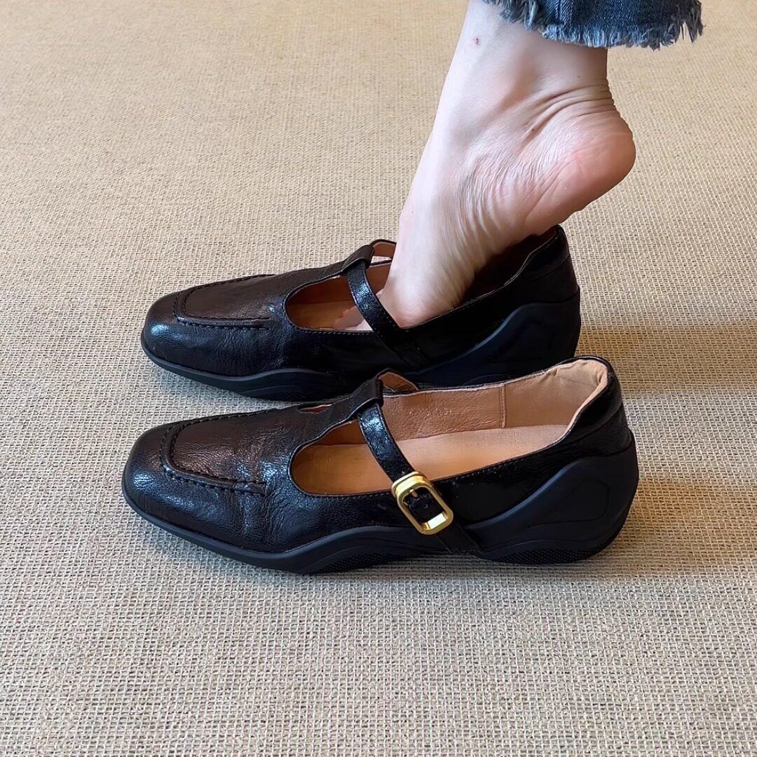 nnmiss/4cm巨好穿法式方头浅口丁字扣带复古运动风厚底小皮鞋