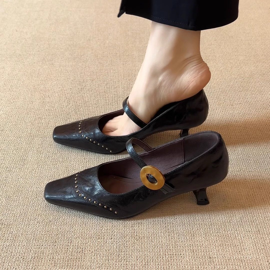 nnmiss34-39/5cm小众方头铆钉浅口一字带复古细跟通勤玛丽珍单鞋