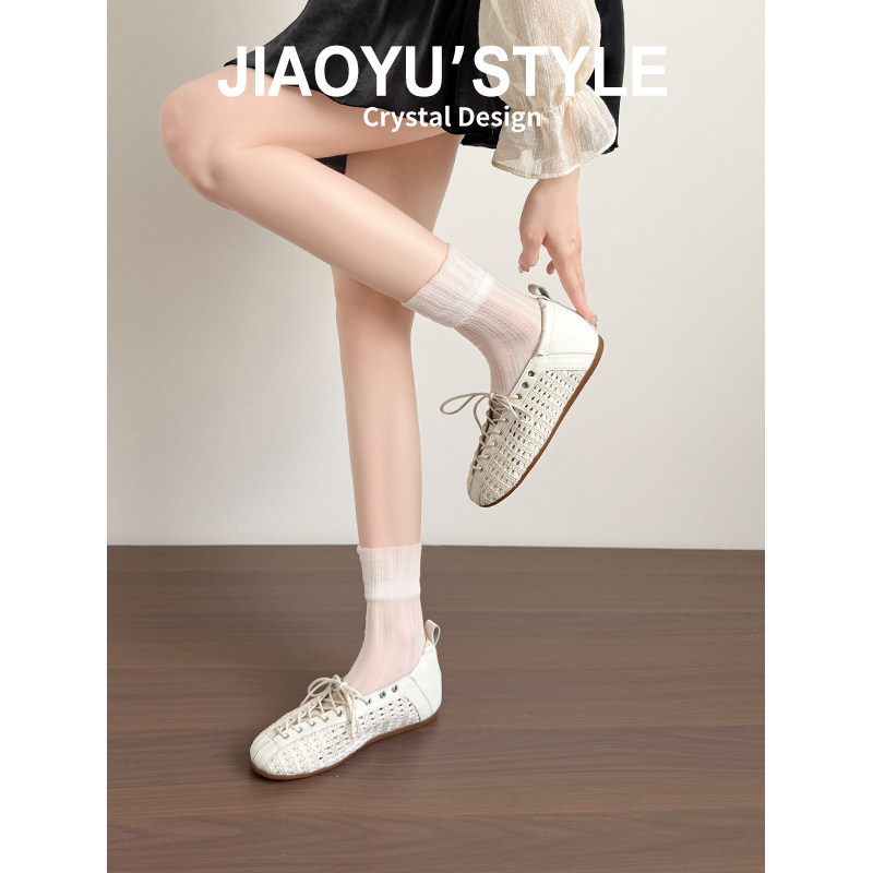 真皮~骄屿复古方头系带单鞋2026新款法式镂空编织芭蕾玛丽珍凉鞋