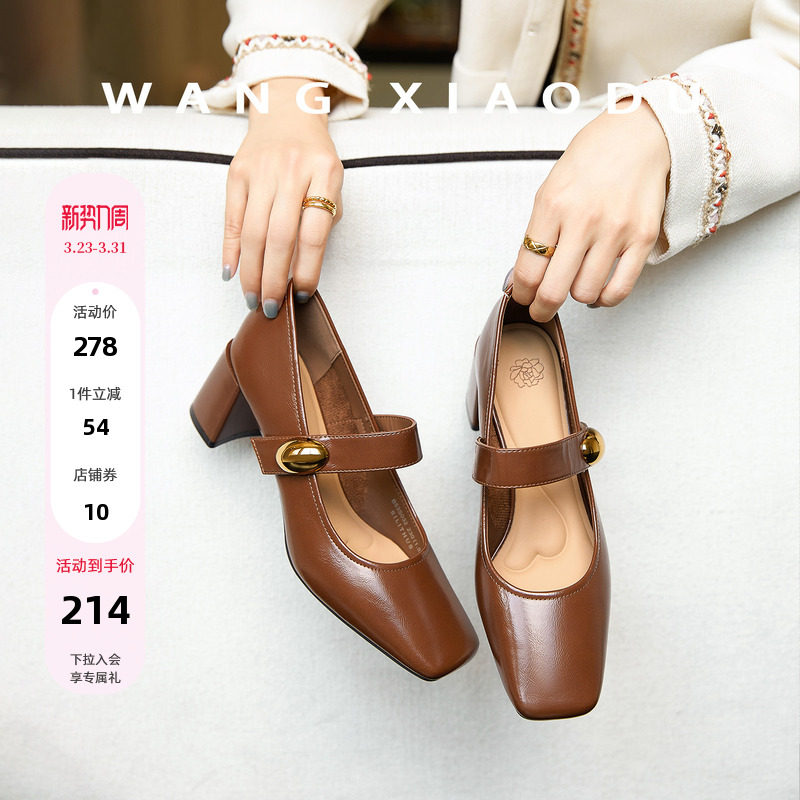 范戈希牛羊皮跟高6cm春法式复古风方头粗跟气质玛丽珍单鞋买1赠3