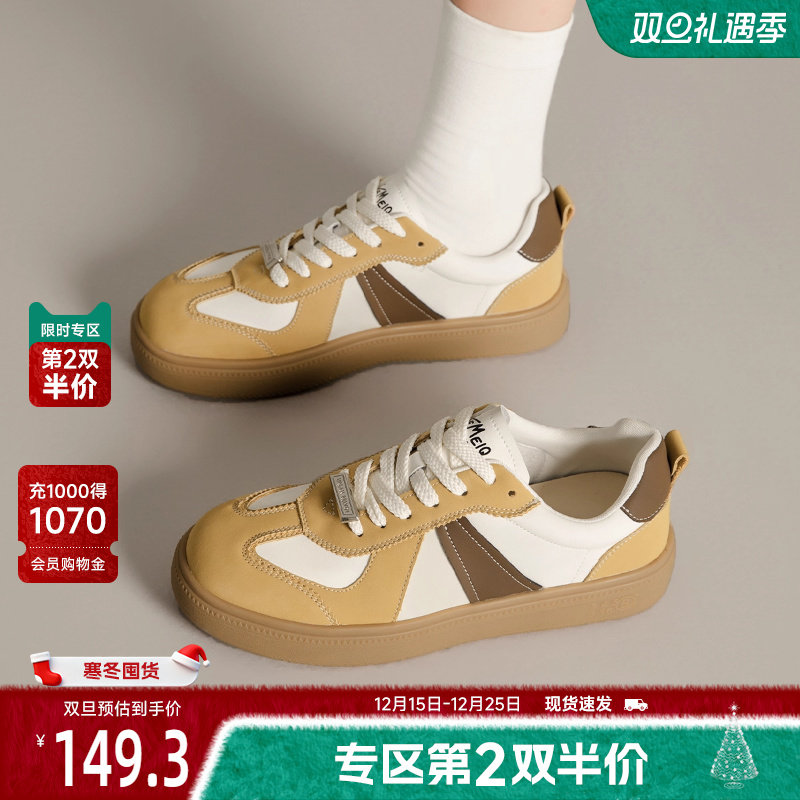 戈美其真皮黄色板鞋款舒适春季新款韩版拼色百搭系带德训鞋小白鞋
