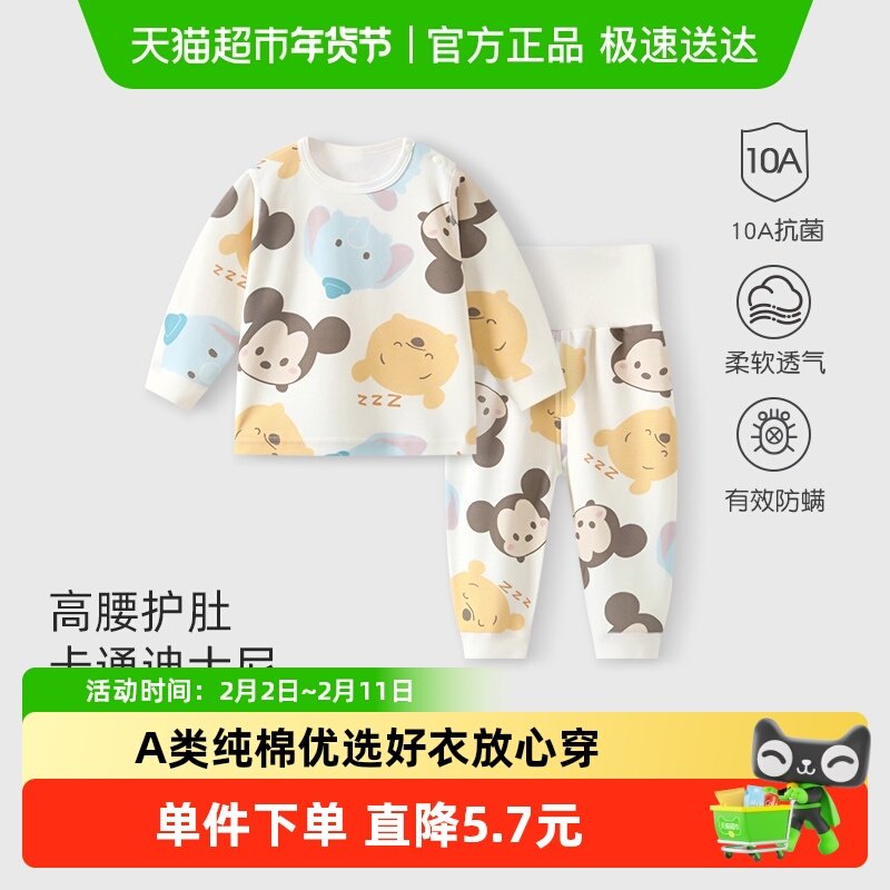迪士尼宝宝分体秋衣秋裤套装高腰婴儿保暖内衣服纯棉男女儿童春秋