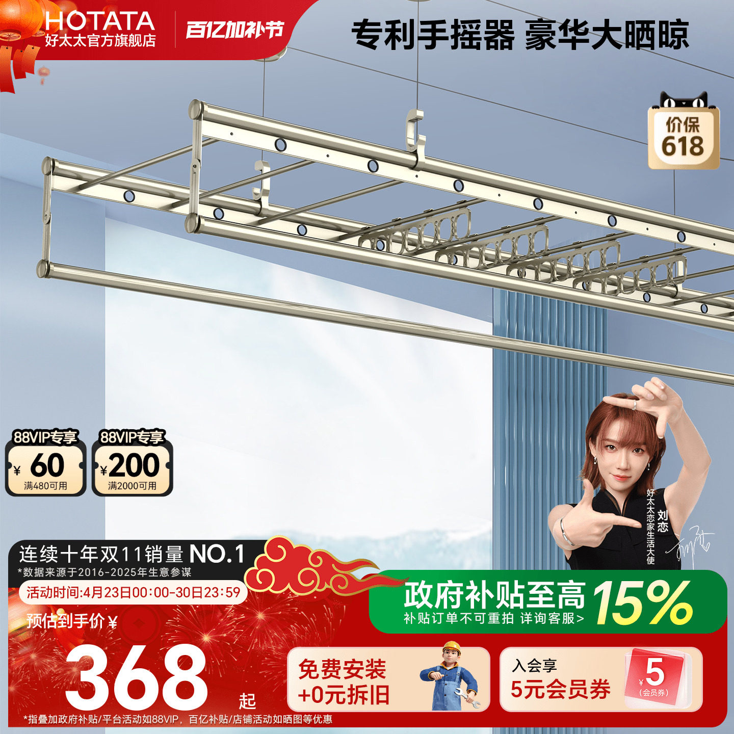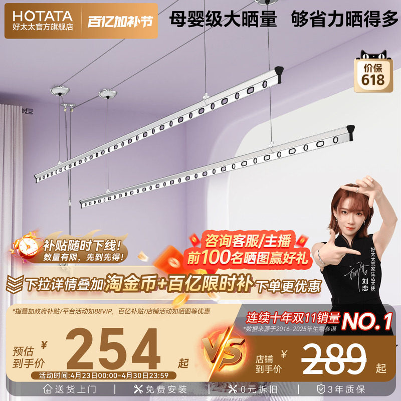 好太太晾衣架手摇式阳台升降家用正品室内固定挂晒杆动2026新款